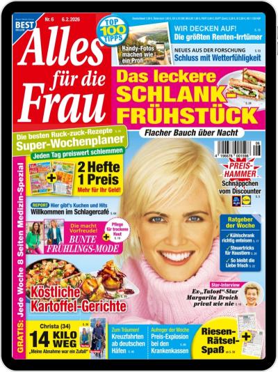 Das ePaper des wöchentlichen Ratgebers „Alles für die Frau“ lohnt sich für alle, die Gesundheit, Ernährung, Kochen, Backen, Mode, Schönheit und Wohnen auch auf ihrem Tablet oder Smartphone erleben wollen.