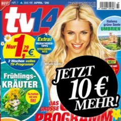 tv14 ist das TV-Magazin, das die Themenvielfalt einer Wochenzeitschrift mit der Übersichtlichkeit eines zweiwöchigen Fernsehprogramms verbindet. Sichern Sie sich eines der erfolgreichsten Magazine Deutschlands im Abo und verpassen Sie kein Heft mehr!